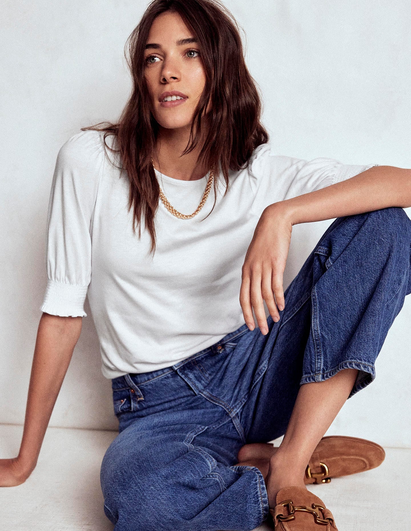 Update your usual jeans and a tee combo with our latest take on the short-sleeve top – the puff sleeves with smocked cuffs make it ideal for work or play.